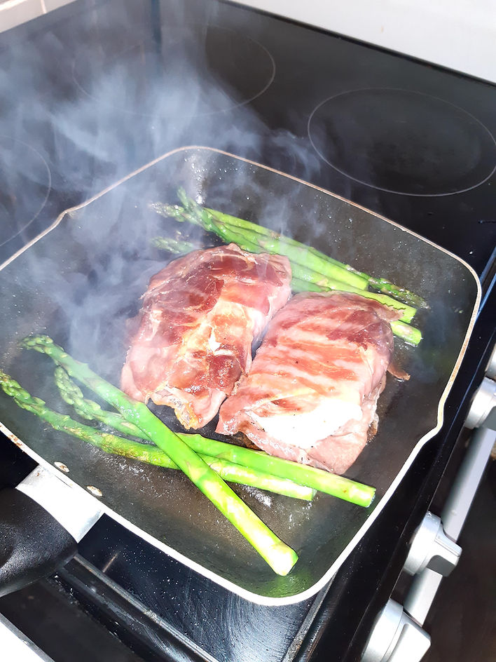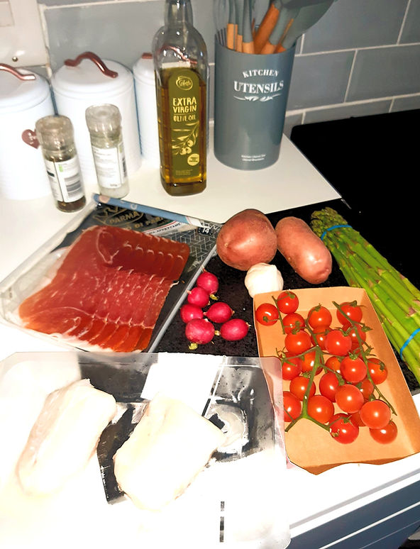 This is a very basic recipe but it works a treat as it is quick and simple. The pancetta brings a smoky flavour to the Cod, I paired with potatoes ad radish slices, Roasted vine tomatoes and Asparagus.