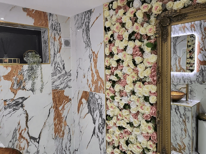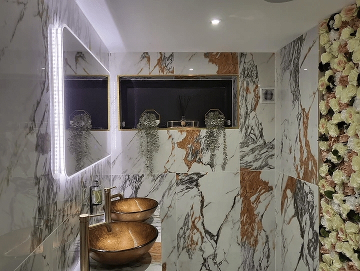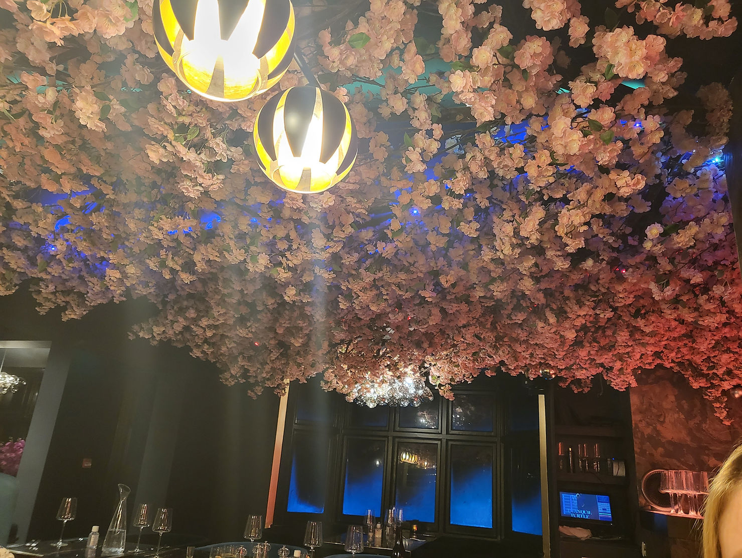 However this aside once you are in the building the transformation is remarkable; as you are transported into a dining area that is more reminiscent of a high end London restaurant/club. With dark décor illuminated by an array of coloured lights and a ceiling of flowers over the dining area. Now we went in the evening and they had music on quite loud, but not so loud you couldn’t hear each other talking. While I am on the subject of Décor and ambience and before I get on to the amazing food and drink I should take time to mention something I mention quite a lot in my reviews — The toilets !!